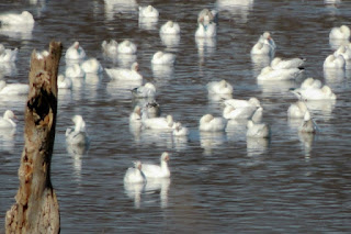 Fortunately just before leaving home today for some errands a friend called with news that a Ross' Goose was begin seen up at Orange County's "Camel Farm" among 1,000 Snow Geese. Since I had not seen this bird since 2008, I was able to adjust my plans and got there within an hour. Pretty quickly I was able to locate the diminutive Goose amongst it's larger cousins. Also 3 Tundra Swans were on the pond too.